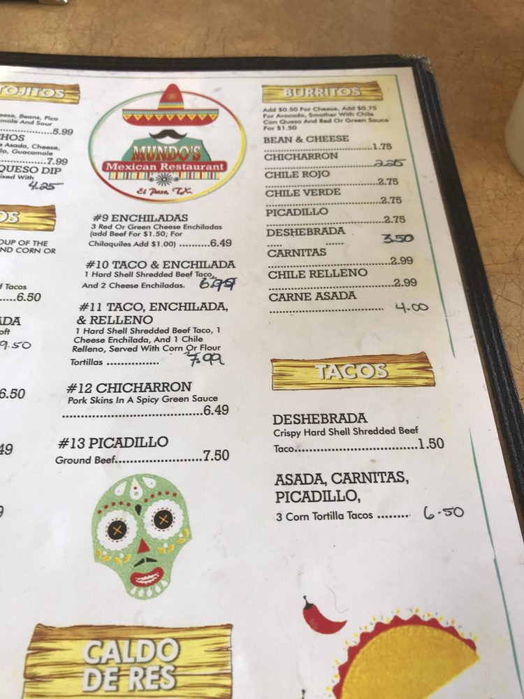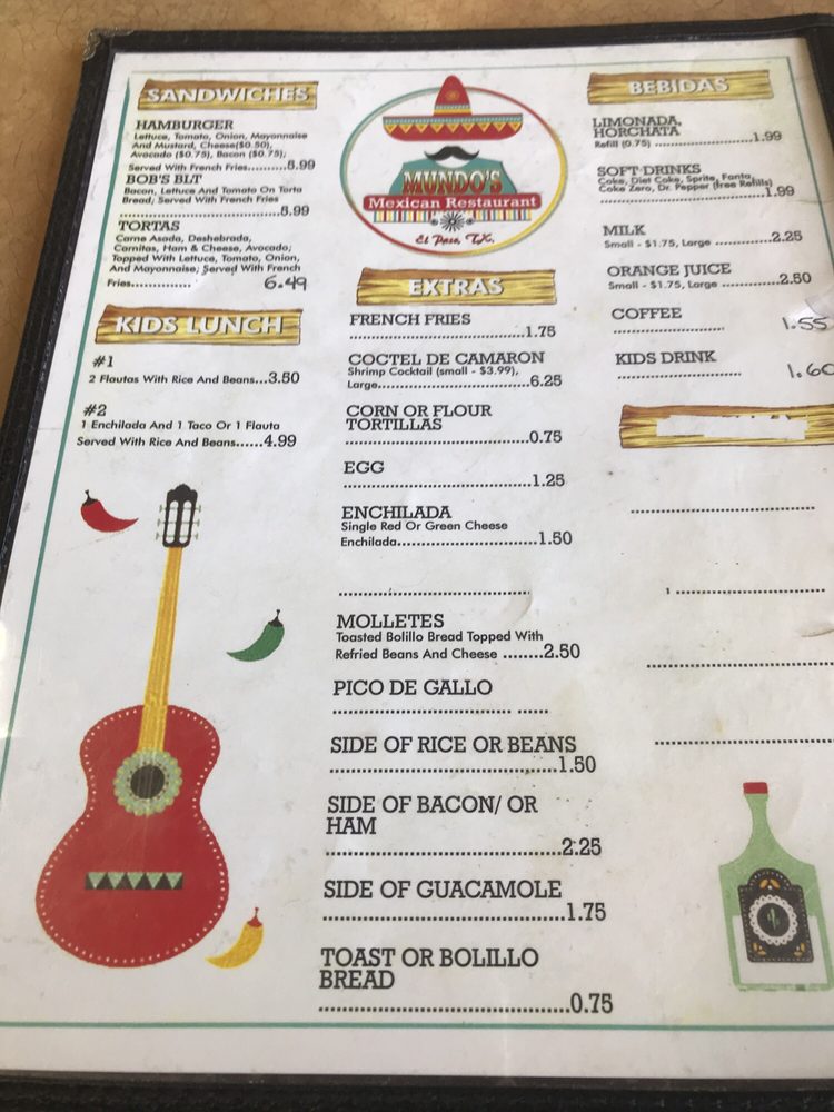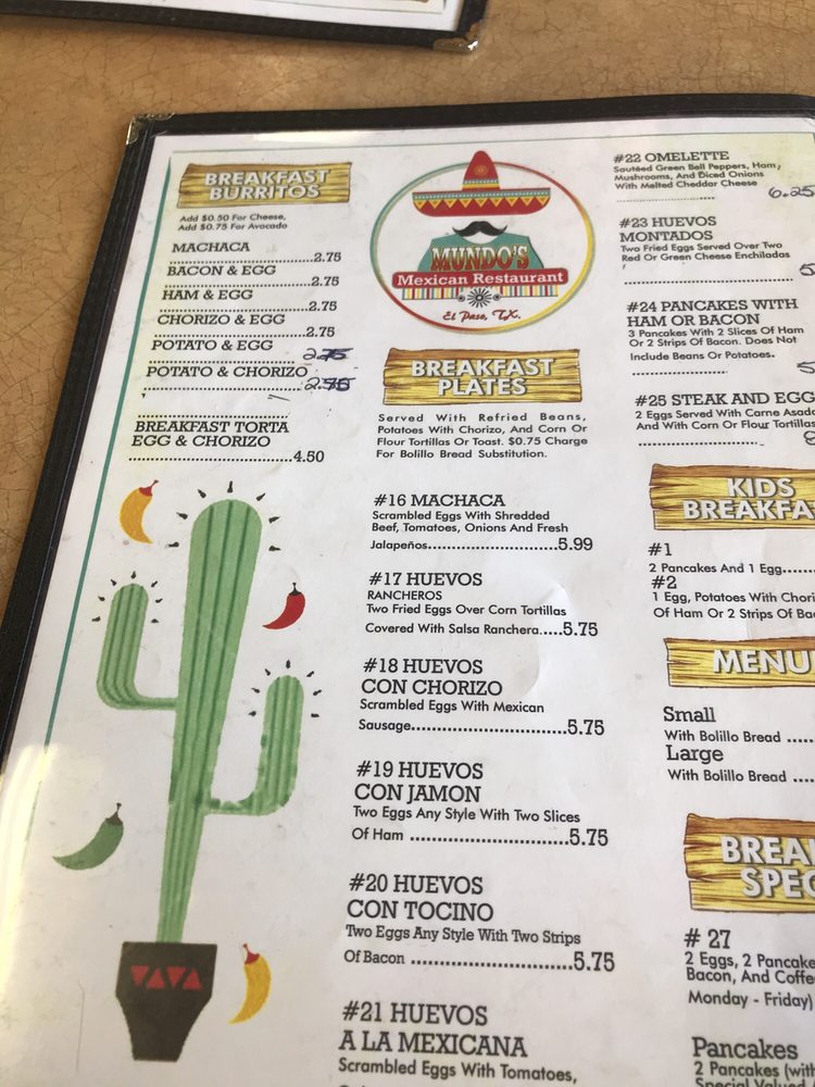 Welcome to Mundo's Restaurant, a culinary gem located at 4006 Doniphan Dr, El Paso, TX. Specializing in breakfast and brunch with a delightful Mexican twist, Mundo's offers an inviting atmosphere for food lovers. The menu features a vibrant array of dishes that highlight authentic flavors, perfect for those seeking a tasty morning meal or a leisurely weekend brunch.